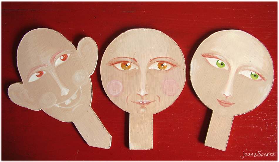 A ideia era fazer uns fantoches ou bonecos (apenas por distracção), precisamente na altura em que se me avariou, irremediavelmente, a máquina de costura. As pequena cabecinhas de madeira foram então esquecidas dentro de um saco entre tecidos, roupas velhas para reciclar, novelos e agulhas de tricot, enfim (bem que aquele armário precisa de uma boa arrumação/organização!).